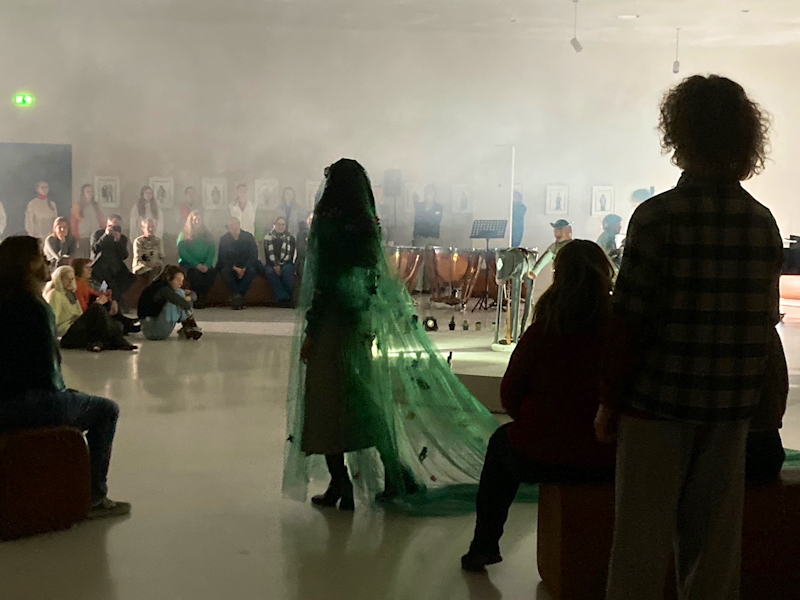 Dieser Teil des Spiels wird dann fortgeführt, indem das Publikum in den Zentralraum 13 des Kolumba geführt wird. Das Schlusstableau ist der diskursive Teil des Stückes. Benjamin Höppner nennt einige Stichworte, wie Stadt zukünftig gestaltet werden soll: Nutzung des öffentlichen Raumes durch wen und mit welcher Priorisierung? Und Transformation des bestehenden Zustands zu einem, in dem Grünflächen und Plätze Menschen zum Aufenthalten einladen. In einer solchen Stadt sind auch Libellen oder Frösche ein Thema. Dazu passt der an die Decke geworfene Dschungelhimmel. Hier kommt noch einmal der Experimentalchor zum Einsatz. Er steuert Klänge und Töne bei, wie sie ein solcher Lebensraum hervorbringen könnte.